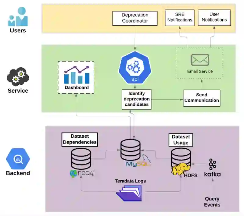我们采用了一条中间路线,借助自动化来协调任务。我们的解决方案的高级架构图如下(图 6)。后端由一个 MySQL 操作数据存储组成,其中的数据来自我们的数据集谱系解决方案。我们构建了一个后端 API 服务来协调废弃工作。该服务会识别候选废弃项,即没有依赖且使用率低的 TD 数据集。随后,该服务向数据集用户发送了关于数据集即将废弃的电子邮件,并通知 SRE 锁定、归档,并在宽限期后从 TD 删除数据集。
