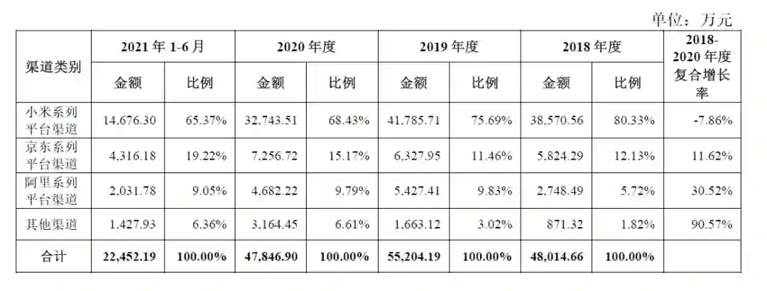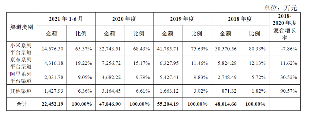 按照趣睡科技对证监会首次问询的回复中的自述,2018-2021年上半年的报告期内,趣睡科技来自小米系列平台的收入分别为3.86亿元、4.18亿元、3.27亿元、1.47亿元,收入占比分别为80.33%、75.69%、68.43%、65.37%。