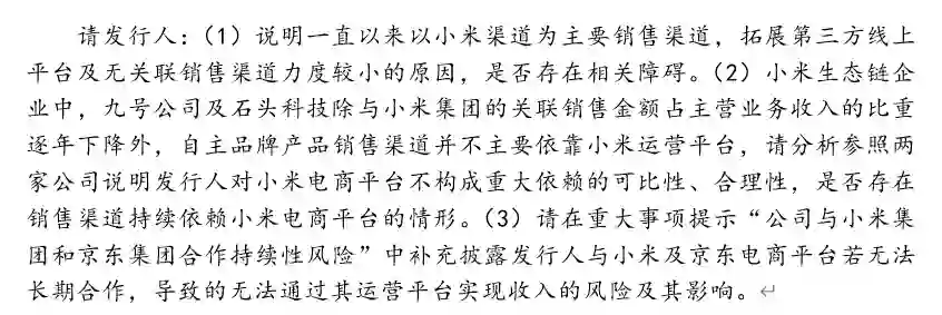 接着,证监会类比了此前的九号公司以及石头科技的案例,要求趣睡科技详细对比论证不会对小米电商平台构成重大依赖。