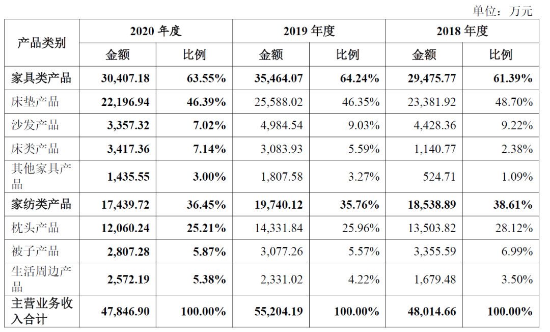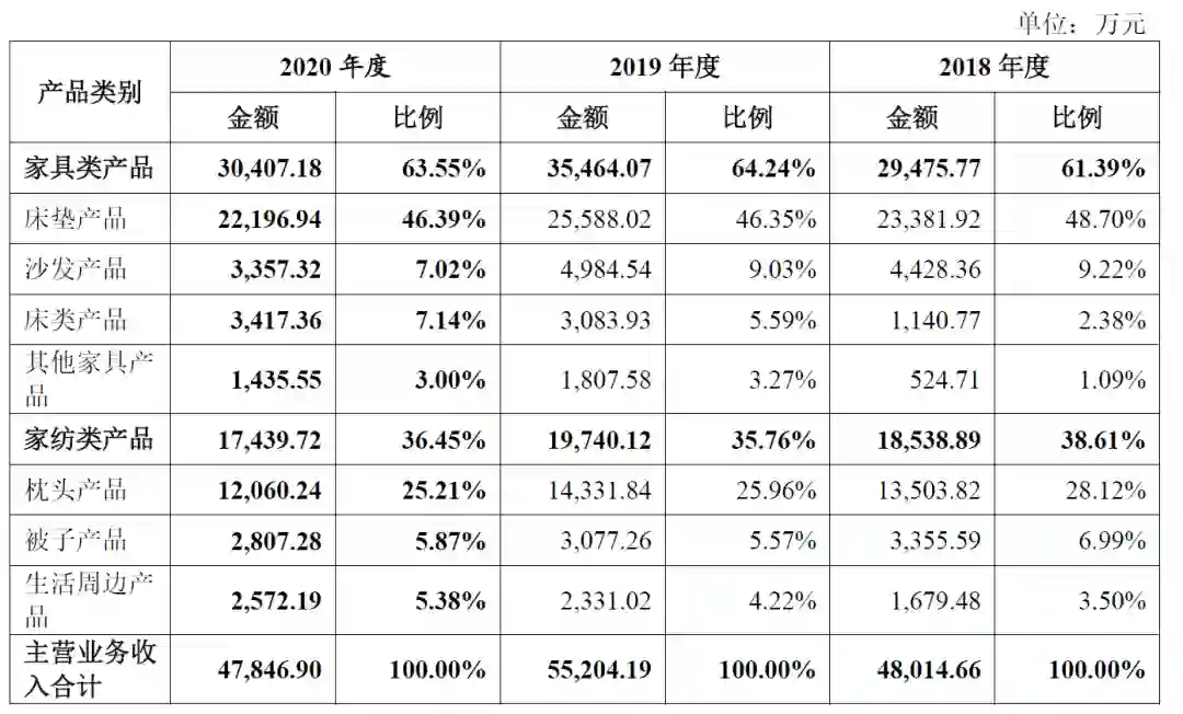 从其首次招股书自行披露的营业收入构成看,床垫及枕头贡献了收入的70%以上。