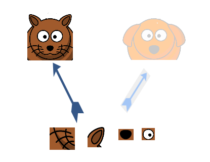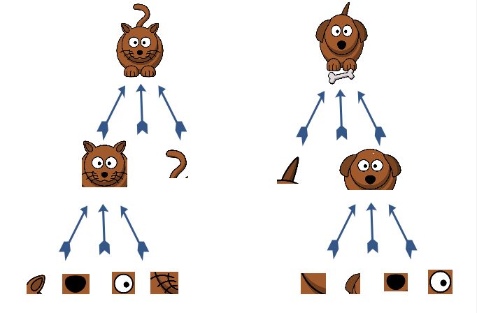 如图所示,定义非常低级的面部特征,比如眼睛、耳朵等,并将其结合以找到一个脸。之后,将面部和身体特征结合来完成相应的任务——判断它是一只猫或狗。