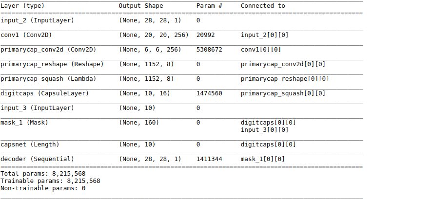 """ A Capsule Network on MNIST. :param input_shape: data shape, 3d, [width, height, channels] :param n_class: number of classes :param routings: number of routing iterations :return: Two Keras Models, the first one used for training, and the second one for evaluation. `eval_model` can also be used for training. """