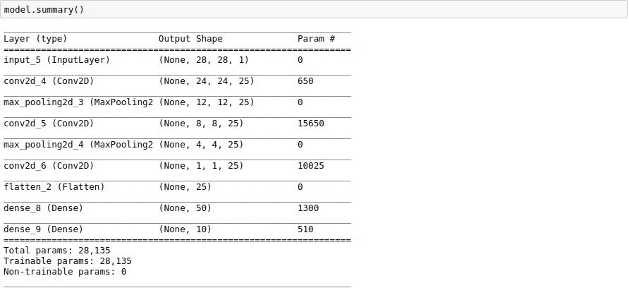 MaxPooling2D(pool_size=pool_size),Convolution2D(25, 4, 4, activation='relu'),Flatten(),Dense(output_dim=hidden_num_units, activation='relu'),Dense(output_dim=output_num_units, input_dim=hidden_num_units, activation='softmax'),])model.compile(loss='categorical_crossentropy', optimizer='adam', metrics=['accuracy'])