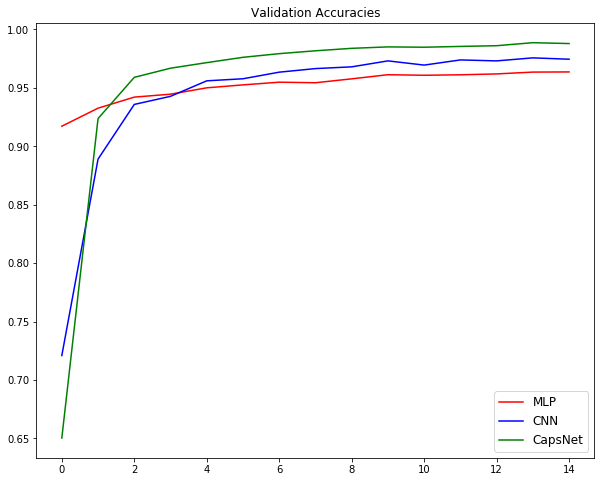 plt.legend(('MLP', 'CNN', 'CapsNet'),