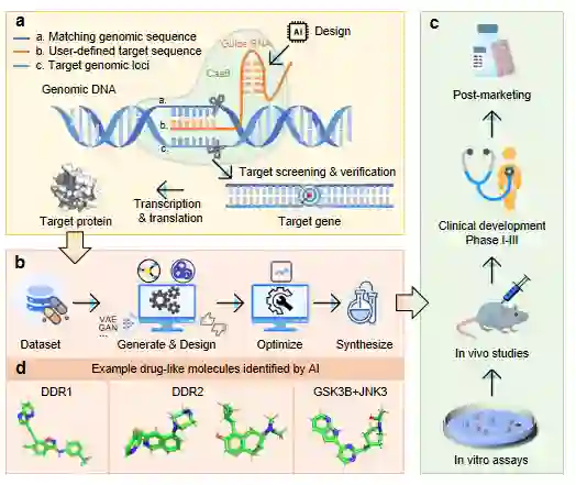 a.人工智能辅助靶标选择和验证;b.分子设计,先导化合物优化和化学合成;c.生物评估(体外和体内),临床开发和上市后监测;d.由人工智能设计进入临床阶段的几个成功分子实例。