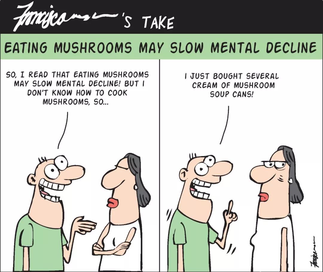 油腻大叔怀个旧,回到科学。那么,为什么吃蘑菇好呢?答案是目前不清楚。但是根据现有证据我们猜想也许与一种叫做麦角硫因(EGT)的成份有关。我们之前的研究也发现患有轻度认知障碍的老人血液里的麦角硫因含量同健康人士相比明显较低。而麦角硫因有抗氧化抗炎的作用,而且能够保护神经细胞。这些机制可能就是我们为什么观察到吃蘑菇多的老人,患有轻度认知障碍的概率比较低的原因。