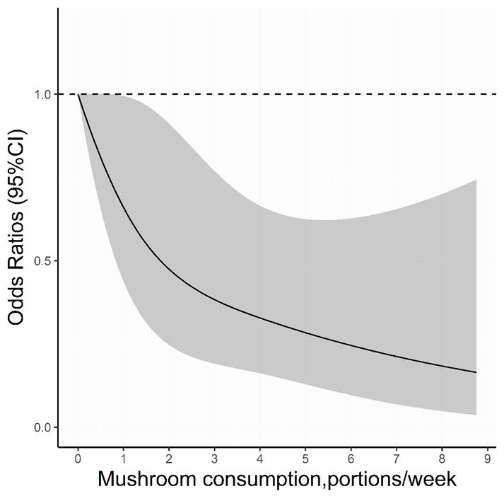 具体到数字:摄入蘑菇少于150克的老人有大约五分之一患有轻度认知障碍,而这个比例在摄入蘑菇大于300克人群里低于十分之一。这个关系在调整了相关混杂变量后依然成立,而且有清楚的剂量关系。蘑菇吃的越多,MCI的风险越低。