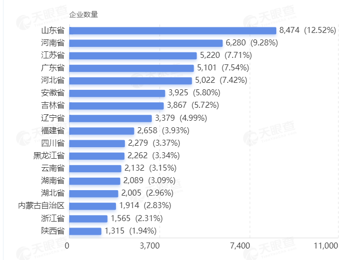从分布区域来看,山东位居第一,占全国总数12.52%,河南、江苏分列二三位。