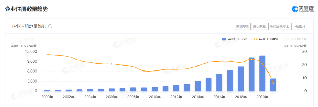 天眼查数据显示,截至目前,全国范围内在营状态的企业名称或其经营范围内包含预制菜的企业数量约为6.77万家,其中2020年新增企业最多,增速为20.81%。近五年,年度注册增速平均19.3%,呈稳定增长。其中2021年,新增注册企业3921家,增速6.2%。