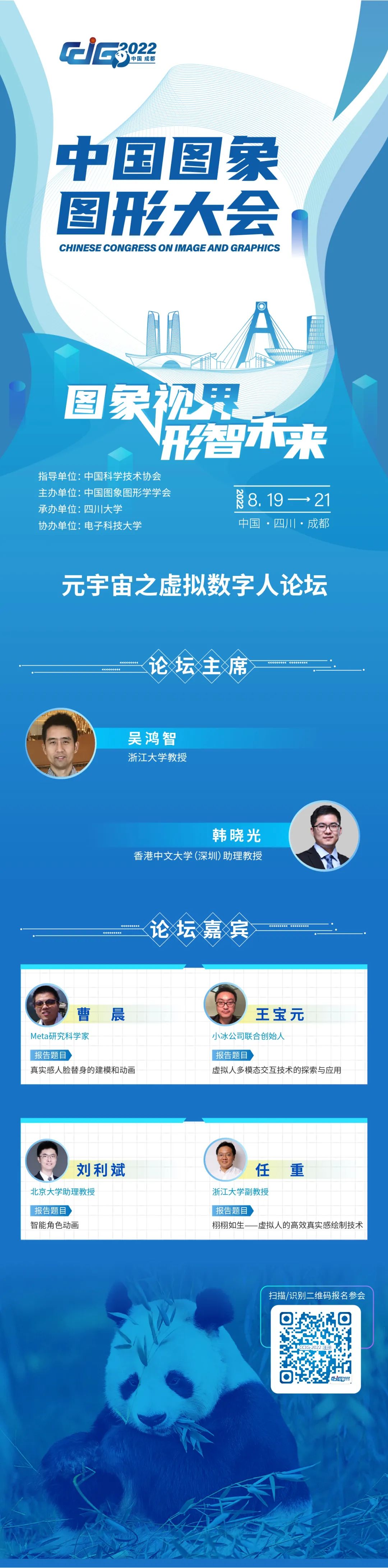 中国图象图形大会(CCIG 2022)将于2022年8月19-21日在成都盛大举办,大会以“图象视界,形智未来”为主题,由中国科学技术协会作为指导单位、中国图象图形学学会主办、四川大学承办、电子科技大学协办。