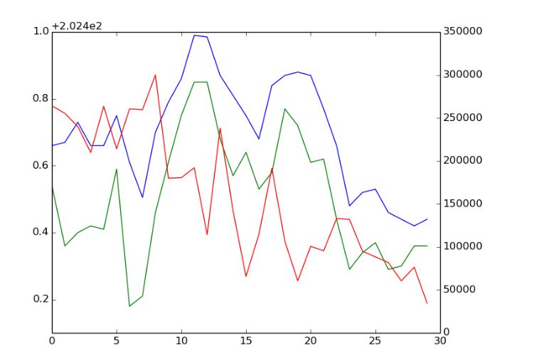 图4:示例图像输入。像以前一样,high price为蓝色,low price 为绿色。 volume(右轴)为红色。