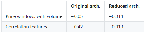 我尝试重复的第一个网络结构convolution-ReLU-pool层(5 blocks),再加入一个fully-connected 层,这个被称为原始架构。不幸的是,这导致性能相当差:样本R2 为 −0.06 ,略差于“总是猜测log返回将是平均值log返回(大约0)”的策略,这将达到(R2)的0。