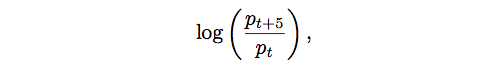 具体来说,回归问题是:从时间t-30到时间t作为输入给出高价格和低价格的图像,作为输出预测从时间t到时间t + 5的对数返回,即预测: