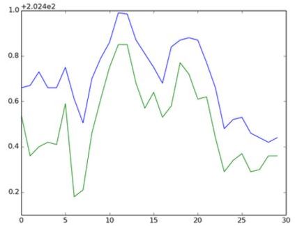 其次,我们的时间序列图应该追溯到过去多远?这在原则上是另一个超参数,应该在卷积网络建立之后进行调整,但就目前而言,我已经用一个30–分钟的窗口进入了过去。总而言之,模型的输入是30分钟时间窗口的高价格和低价格的图形。这些图像使用numpy和matplotlib库绘制,并保存为RGB图像。 示例输入如下图2.2所示。