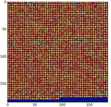 总体而言,前十大股票包含了标普500指数的17.53%。我使用这10个组成部分以下列方式计算神经网络的输入:在每个30分钟的窗口内,我收集了标普500指数和十大成分中的每一个的平均价格(low price和high price的平均值)时间序列。然后,我计算了SPY的价格系列与每个成分的价格系列之间的关系系数。这导致-1和1之间的十个不同的值。然后我将这10个值绘制在热图中,颜色范围从红色(高相关)到蓝色(低相关)。示例功能图像如下所示图5。希望在标普500指数走高的同时,其与成分股的关系呈现出不同的下跌趋势的模式。