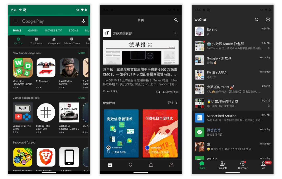 Play 应用商店、少数派客户端、微信在强制暗色主题下的效果