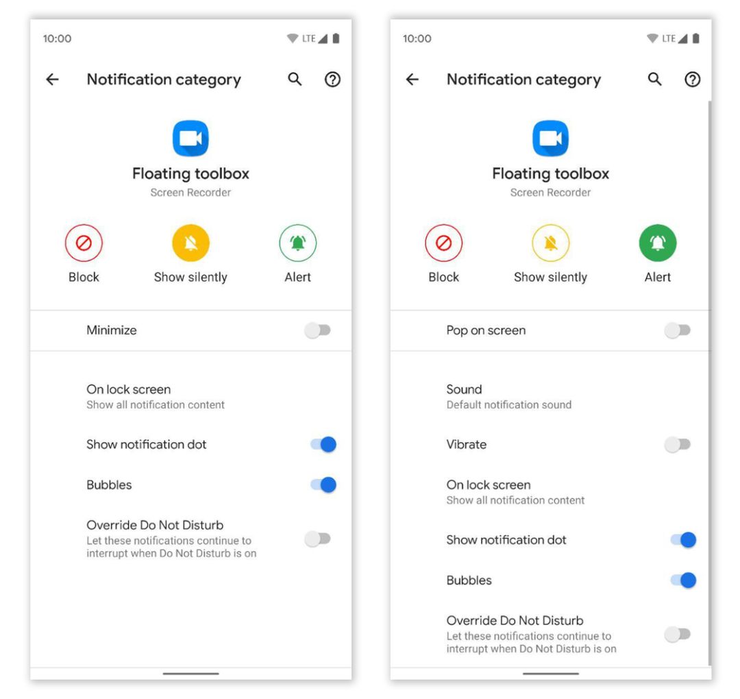 最后,通知分类管理界面也因此调整了设置和交互方式,上面提到的三种提醒方式对应为提醒、静默显示和屏蔽三种通知状态,选中提醒和静默显示图标时,下方设置列表会提供相应的进阶设置,如静默通知是否在锁屏上显示、提醒时是否显示浮动通知、提醒时是否发出振动等等。这是通知设置交互方式上的简化。