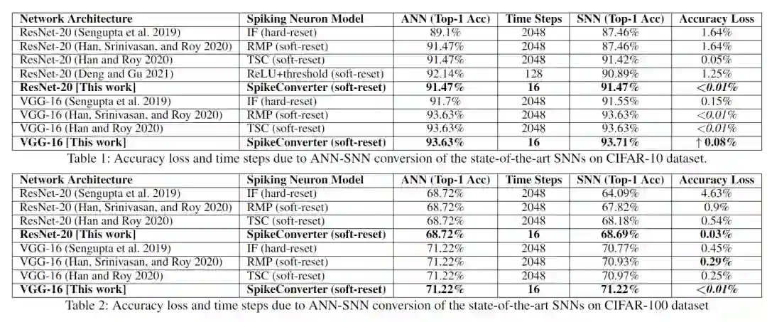 文章使用 CIFAR-10/100,以及 ImageNet 数据集进行实验。实验结果表明文章提出的方法在仅需要 16 个时间步的情况下,可以达到和传统神经网络几乎一致的精度。极大节省空间存储和计算代价的情况下取得了最佳的性能,具体实验结果参见论文。部分结果如下。