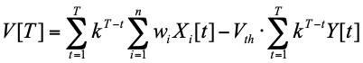 在理想情况下,最后神经元内没有膜电压存留,即 V[T]=0。此时,公式 (2) 可以简化为