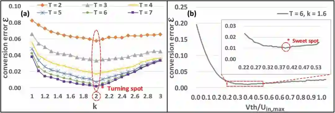 参数选择方面,主要是电压增幅系数的选择。文章考虑了不同的时间步数量和增幅系数的情况下,平均的转化误差。实验表明在不同的时间步选择下,k=2 都是最优选择。