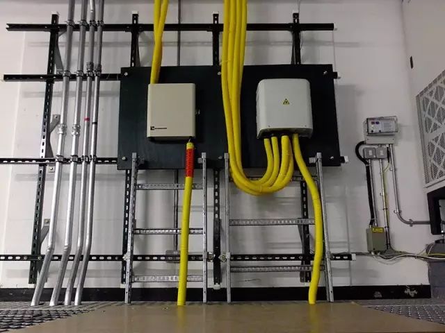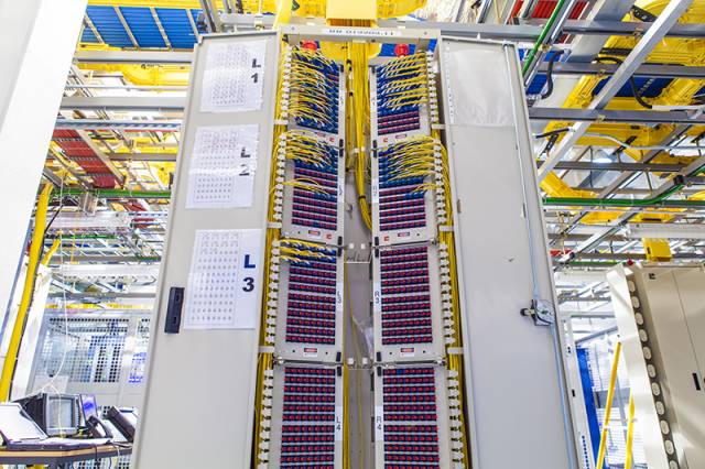 这些黄色光缆接入到各种配线架。这些配线架实现对海底光缆线路的连接、分配和调度,并通过配线架连接到运营商的传输终端设备。