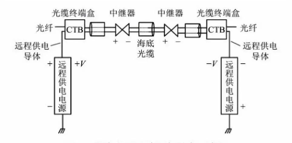 如上图所示,海底光缆系统在两端的陆地上配置了远供电源设备。它通过海底光缆上的远供导体,向海底中继器馈电,从而解决供电的问题。