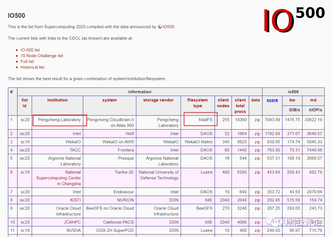 这一文件系统也被用在了鹏城实验室的超算系统上,参加了全球公开的IO500测试,获得了今年IO500 榜单的第一名。