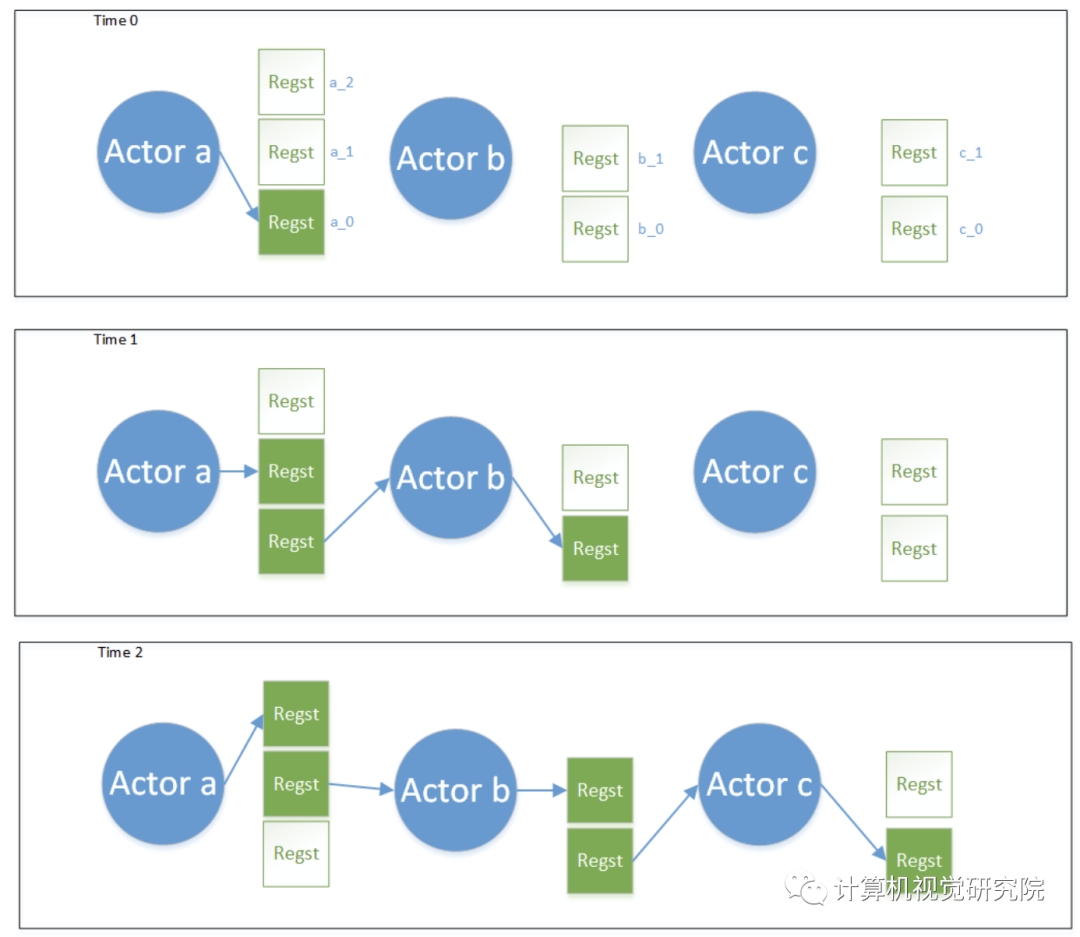 我们举一个例子来解释 Actor 机制下的流水线是如何运转起来的。下图是一个由3个 Actor(a, b, c)组成的计算图的执行时序图。其中深绿色的 Regst方块表示正在被使用的 Register 块,白色的 Regst 方块表示同一个 Register 的备用空闲块。