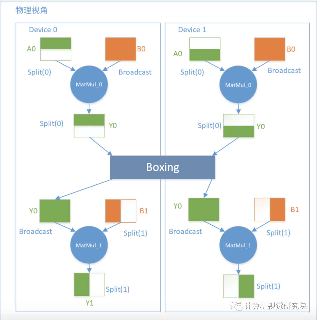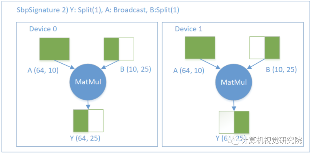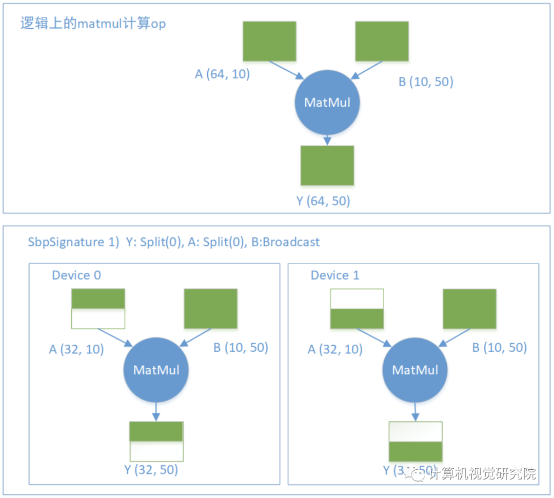 且该 Op 分布在两个设备上。在第一种 SbpSignature 下,0号设备上的A是逻辑上 A 的前一半,1号设备上的 A 是逻辑 A 的后一半(按照第0维切分),而两个设备上的 B 跟逻辑上的 B 完全一致,两个设备输出的 Y 分别是逻辑上的 Y 的前一半和后一半。同样可以分析第二种 SbpSignature。