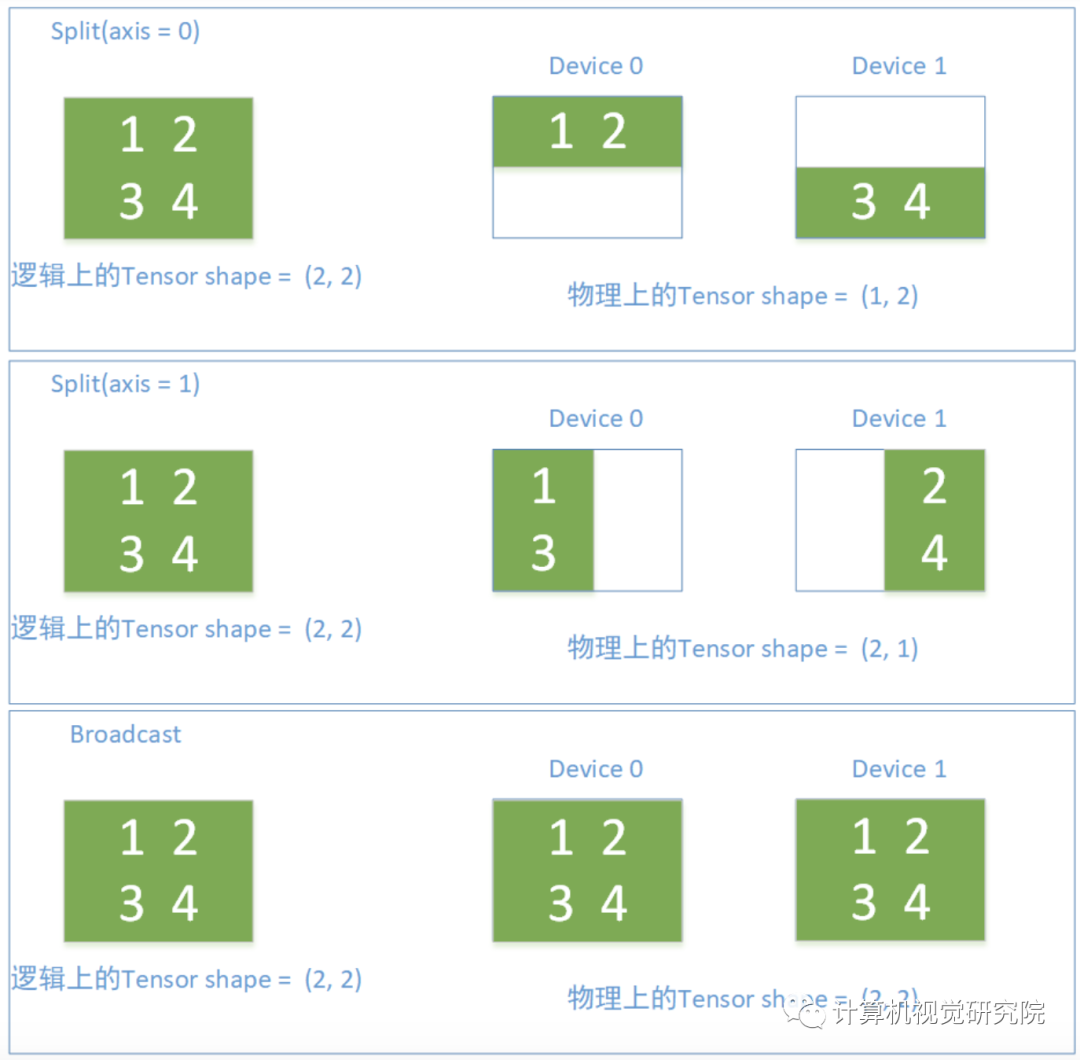 其中 Split 表示物理上的 Tensor 是逻辑 Tensor 按照某一维度切分后得到的, Split 有个参数 axis,表示切分的维度,如果把多个物理上的 Tensor 按照 Split 的维度进行拼接,就能还原出逻辑 Tensor。