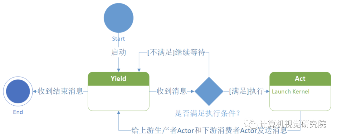 在 Actor 启动之后,会根据与其他 Actor 之间收发消息来切换自己的两个状态:等待状态 和 执行状态 。