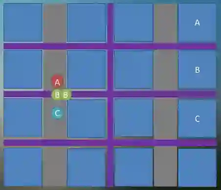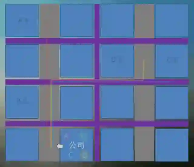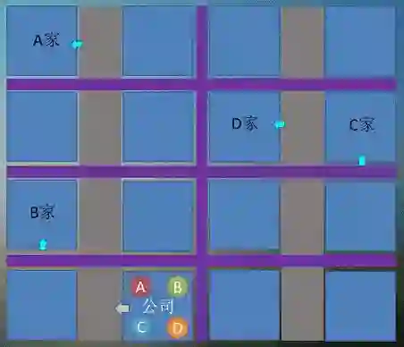 同时出发,假定灰色道路为快速路通行能力为可同时通行2辆车,紫色道路为普通道路同时间仅能通行1辆车,从一个路口到另一个路口需花费2个单位时间。假设四人发车顺序为A-B-C-D,那么: