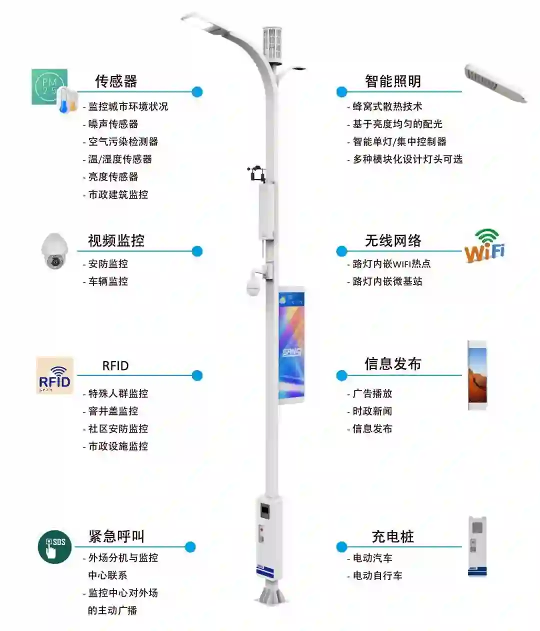 基于路灯杆,集成高清摄像头、小型信息屏、物联网中继、Wi-Fi探针、车路协同设备、小型标识标牌等设备设施,支持道路全景监控、交通运行监测、道路险情预警(面向道路设施养护)、车路协同交互、智能定向诱导、沿线设备物联网等服务功能。
