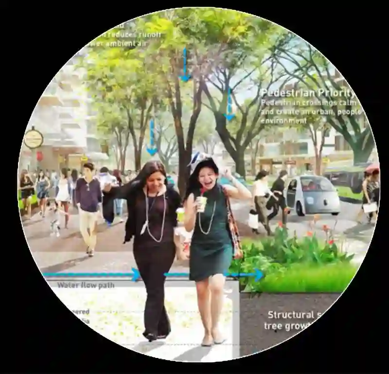 街道智能设施规划,每一样街道设施都将植入计算机设备和感应设施通过互联网相互连接,进行数据的收集及设施的管控。例如停车位追踪设施、智慧道路全息感知设施和智慧路贴。