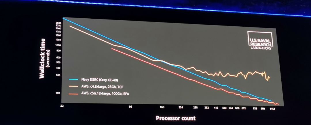 上图所示为美国海军研究实验室用超算 Cray XC40、c4 集群与 c5n 集群分别进行天气预报计算的性能比较:纵轴为计算用时,横轴为并行参与计算的 CPU 数量。可以看出,c4 集群(使用 TCP 协议)用到了 200 个以上 CPU 参与并行计算之后出现明显瓶颈,而 c5n 集群(开启了 EFA 网络功能绕过了 TCP 协议——这是最新款 nitro 系统提供的能力之一)即使超过 1000 核也没有呈现明显瓶颈,在计算用时方面的表现已经超越了 Cray XC40。