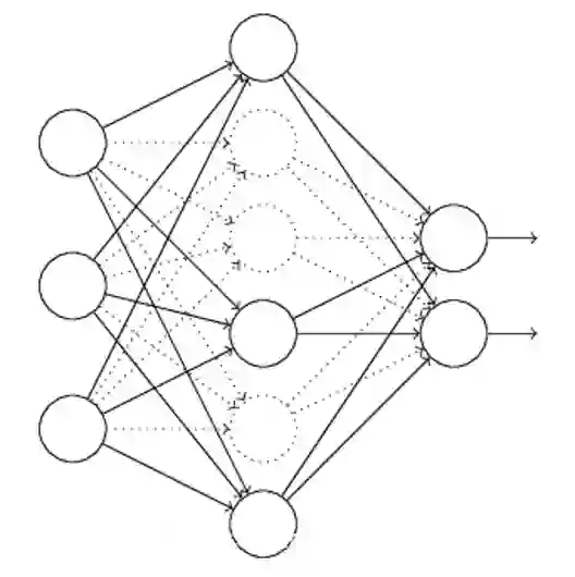 假设我们要训练上图这个网络,在训练开始时,我们随机地“删除”一部分的隐层单元,视它们为不存在。