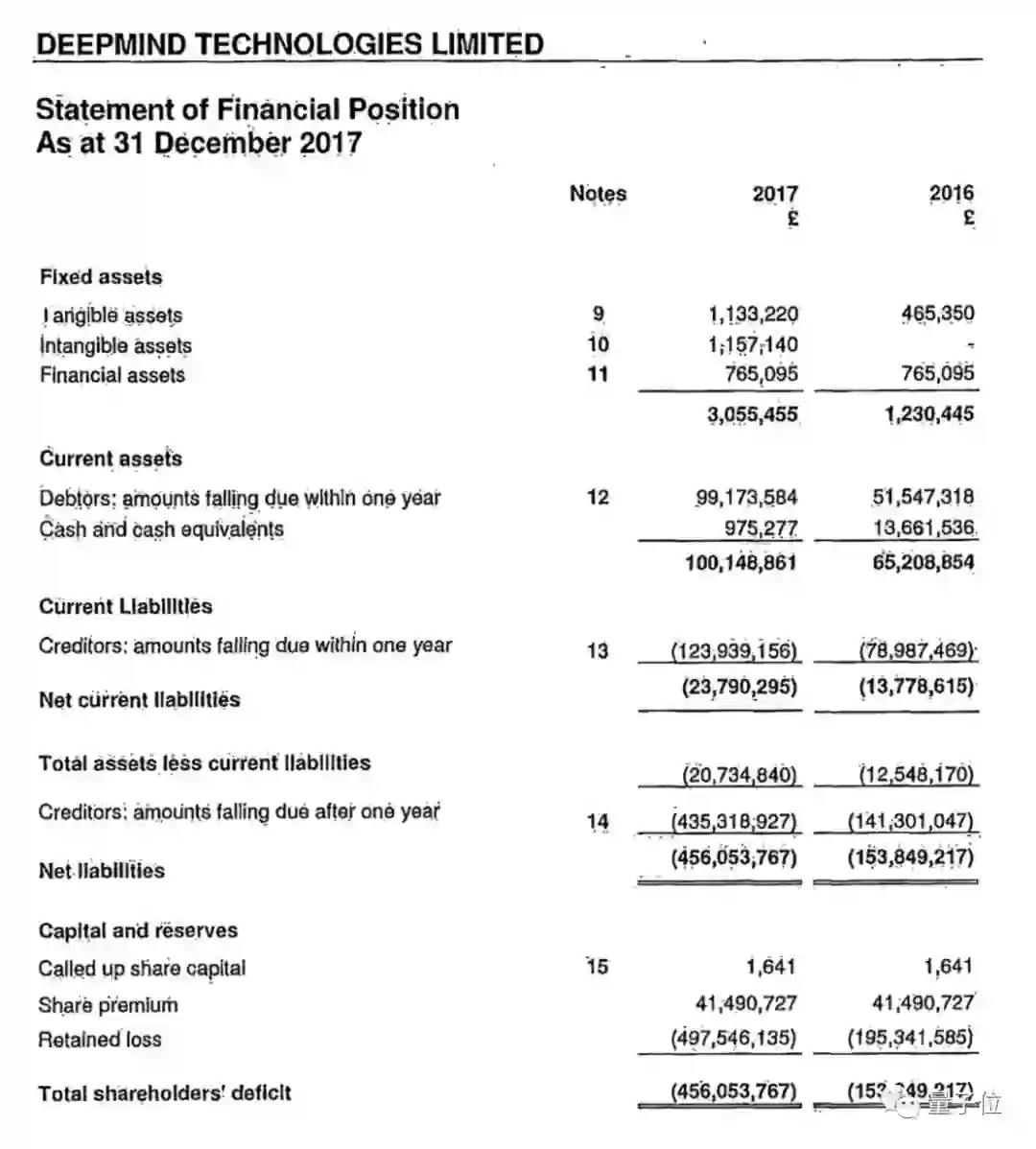 截至2017年12月31日,DeepMind持有现金和现金等价物97.5万英镑,账面上亏损4.98亿英镑。