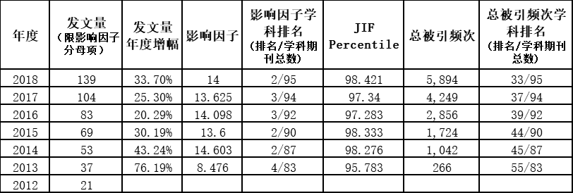 Light自创刊以来,发文量持续增长,各项指标稳步提升,参见表1。2018年总发文量153篇,与2017年相比增长了37%,与创刊年2012年相比增长了近600%(2012年发文量22篇)。同时,发文类型不断丰富,可发表Original article、Review、News and Views、Letter、Perspective、Editorial共6种类型的文章。