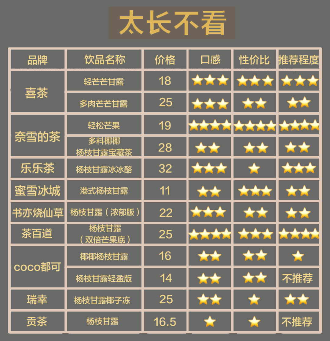 喝了9家店的12杯杨枝甘露之后,我们一致认为杨枝甘露这种饮品想要吃到新鲜芒果和基本口感的,没有18块就不要想了,毕竟在正宗的港式茶餐厅里一小碗也得要20以上了。饮品店的杯量动辄400ml起,在这种情况下想要喝到好喝的杨枝甘露必然是要更贵一些。天气回暖,大家想喝冰饮的心按耐不住了,表示理解但也不要贪杯!毕竟西柚是真的很促进肠胃蠕动(不幸的回忆不愿再提)……