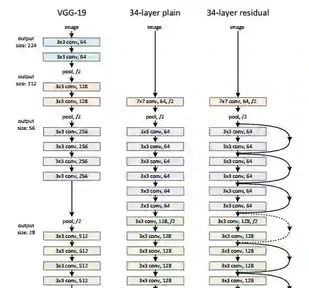 该网络的架构和 VGGNet 类似,主要包括 3x3 的卷积核。因此可以在 VGGNet 的基础上在层之间添加捷径连接以构建一个残差网络。下图展示了从 VGG-19 的部分早期层合成残差网络的过程。