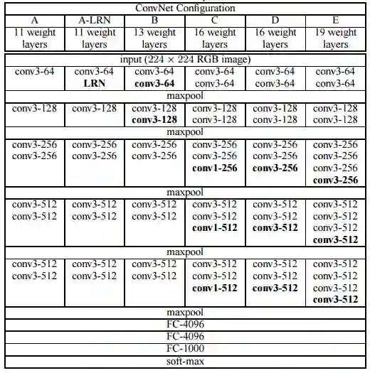 该架构由牛津大学的 VGG group 提出。它通过相继使用多个 3x3 卷积核大小的滤波器取代大尺寸卷积核滤波器(第一个和第二个卷积层分别有 11 个和 5 个滤波器)实现了优于 AlexNet 的性能。给定感受野(输出所依赖的输入图像有效区域大小),利用多个堆叠的更小尺寸的卷积核取得的效果优于使用更大尺寸的卷积核,因为多个非线性层会增加网络的深度,从而允许其学习更复杂的特征,并且计算成本更低。