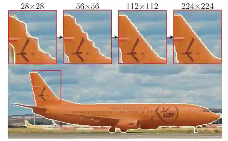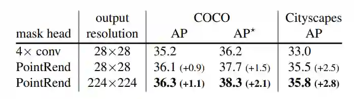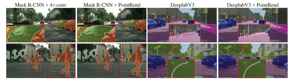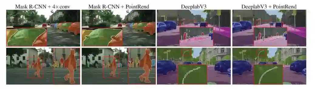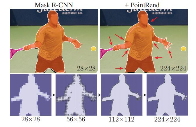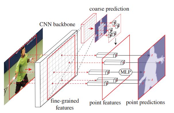 基于这种类比,研究者提出 PointRend(Pointbased Rendering,「基于点的渲染」),用点的表征来解决图像分割问题。PointRend 模块接受一或多个包含 C 个通道的典型 CNN 特征图 f ∈ R^(C×H×W),每一个特征图都基于规则网格定义(其粗糙程度通常是图像网格的 4-16 倍),输出预测结果共有 K 个类别标签 p ∈ R^(K×H'×W'),输出基于不同分辨率(大概率分辨率更高)的规则网格。