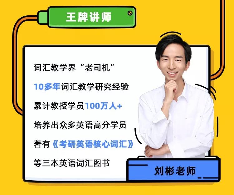 20000词汇速记营是由10多年教学经验,著有《考研英语河核心词汇》、拥有10多年教学经验,授课学员达100万+的刘彬老师领衔主讲。