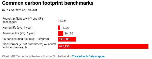 2020年6月,马萨诸塞大学的研究人员发布了一份报告,估算出训练和搜索某个模型所需的能量大约需要626,000磅的二氧化碳排放量,相当于美国汽车平均寿命排放量的近5倍。