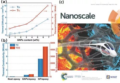 图1 (a) 环氧复合材料导热系数与石墨烯含量的关系;(b) 环氧复合材料较纯环氧树脂和传统共混法制备的复合材料的导热增强比;(c) 论文封面