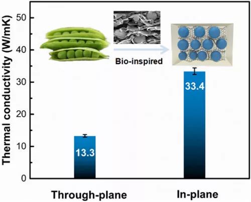 除此之外,研究还发现在石墨烯抽滤过程中引入微米尺度的球形氧化铝颗粒,可以使得石墨烯片取向由水平方向部分转变为纵向方向,得到具有类似“豌豆荚”的结构。这类仿“豌豆荚”结构的二元石墨烯-氧化铝填料可有效增强聚合物材料的导热性能,该方法制备的环氧复合材料纵向和横向的导热系数分别可达到13.3W/mK和33.4W/mK(如图2所示)。