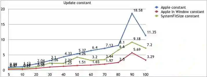 因为这里没有不含 UILabel,UIView 等有 intrincContentSize 的 UIView,update constant 基本就是 Cassowary 更新约束的耗时。Applelayout 和 Apple NestLayout 则也包含 UIView 创建,约束创建和求解的时间。