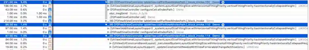 1.以 FDTemplateLayoutCell demo,为例,我们对同一个 cell 连续执行三次一样的代码,