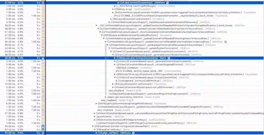 虽然由于上述种种问题, 但如上图所示 heightForRowAtIndexPath 里调用 systemLayoutSizeFittingSize 再加上 cellForRowAtIndexPath 里调用 layoutIfNeeded 总耗时看起来也并不是很多,40 个 view 左右耗时也不到 4 ms,看起来还可以,为什么实际使用起来表现却差很多呢。