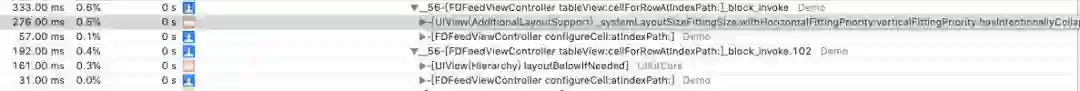 这是 FDTemplateLayoutCell profile 的一段结果,展开部分是 cellForRowAIndex 里运行的代码。